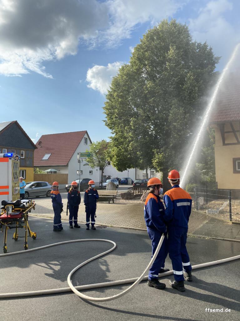 Bei der heutigen „Abschlussübung“ rettete die Jugendfeuerwehr 5 verletzte Personen und Puppen. Angenommen wurde ein ausgedehnter Brand im Vereinsheim der Schützen. Die Abschlussübung ist immer die letzte Übung bevor die Sommerferien beginnen. Dieses Jahr werden wir aufgrund der ausgefallenen Termine auch in den Sommerferien Übungsdienste anbieten.