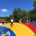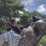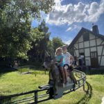 Die Lochmühle bietet viele kindgerechte Attraktionen an. Zu Beginn waren wir kurz im Indoor-Bereich. Hier gibt es alles was Kinderherzen bei Regen schneller schlagen lässt. Im Eingangsbereich starteten wir direkt mit dem Freefall-Tower, dem Kettenkarussell, den Adlern (eine Art Schiffschaukel) und fuhren mit den roten und gelben Hubschraubern über der Lochmühle. Die meistgenutzten Attraktionen unserer Löschdrachen waren die große Teppichrutsche und die Eichhörnchenbahn – eine Achterbahn. Zwischendurch stärkten wir uns mit Pommes und Nuggets oder mit Spaghetti und Tomatensoße und einer kühlen Caprisonne. Auch der Streichelzoo und die Traktorrunde mit bewirtschafteten Mini-Feldern wurden genutzt. Bevor wir die Heimreise antraten hüpften wir auf dem großen Luftkissen, versuchten uns als Goldgräber und fuhren nochmal schnell die Eselbahn.