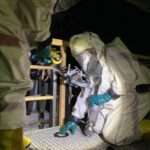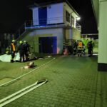 Bereits bei Erkundung durch den ersten Fahrzeugführer stellte dieser fest, dass eine Person bewusstlos im leeren Klärbecken liegt und ein Stoff in der Nähe der verunfallten Person austritt. Demnach wurde das Vorgehen gemäß GAMS-Regel (Gefahr erkennen, Absperren, Menschenrettung durchführen, Spezialkräfte alarmieren) fortgesetzt. Noch während die Notdekontaminationsstelle in Form von 4 Steckleiterteilen, einem Spanngurt und einer Plane errichtet wurde, erfolgte die Rückmeldung an die Übungsleitung, dass fiktiv ein Gefahrstoffzug zum Abdichten der Leckage benötigt werde. Bis hier kein ungewöhnlicher Ablauf.