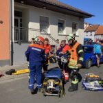 Nahtlos zeigte die Jugendfeuerwehr ihr Können bei der Abwicklung eines Verkehrsunfalls zusammen mit dem Rettungsdienst. Die Zuschauer bildeten anschließend heimlich eine lange Schlange an der Essensausgabe, da man im Ort weiß, dass gegen 12 Uhr die ersehnte Erbsensuppe auf den Hof kommen wird. Neben der legendären Erbsensuppe war auch die neu ins Leben gerufene vegetarische Kartoffelsuppe ruckzuck ausverkauft! Insgesamt über 30 gespendete Kuchen erhöhten abermals die Spendeneinnahmen für den guten Zweck. Die neue Candy-Bar der Löschdrachen lockte zahlreiche Süßmäuler. Ein weiteres Highlight waren Abnahme und Übergabe der Tatze 4 an acht Kinder der Kinderfeuerwehr. Dieses Abzeichen ist jeweils durch das Absolvieren verschiedener Aufgaben rund um die Feuerwehr zu erlangen. Das Abzeichen soll zur Mitarbeit motivieren, Spiel und Spaß bleiben jedoch im Vordergrund. Hüpfburg, Mitmachspiele, Feuerlöschtrainer und eine große Tombola der Jugendfeuerwehr rundeten das Wochenende ab.