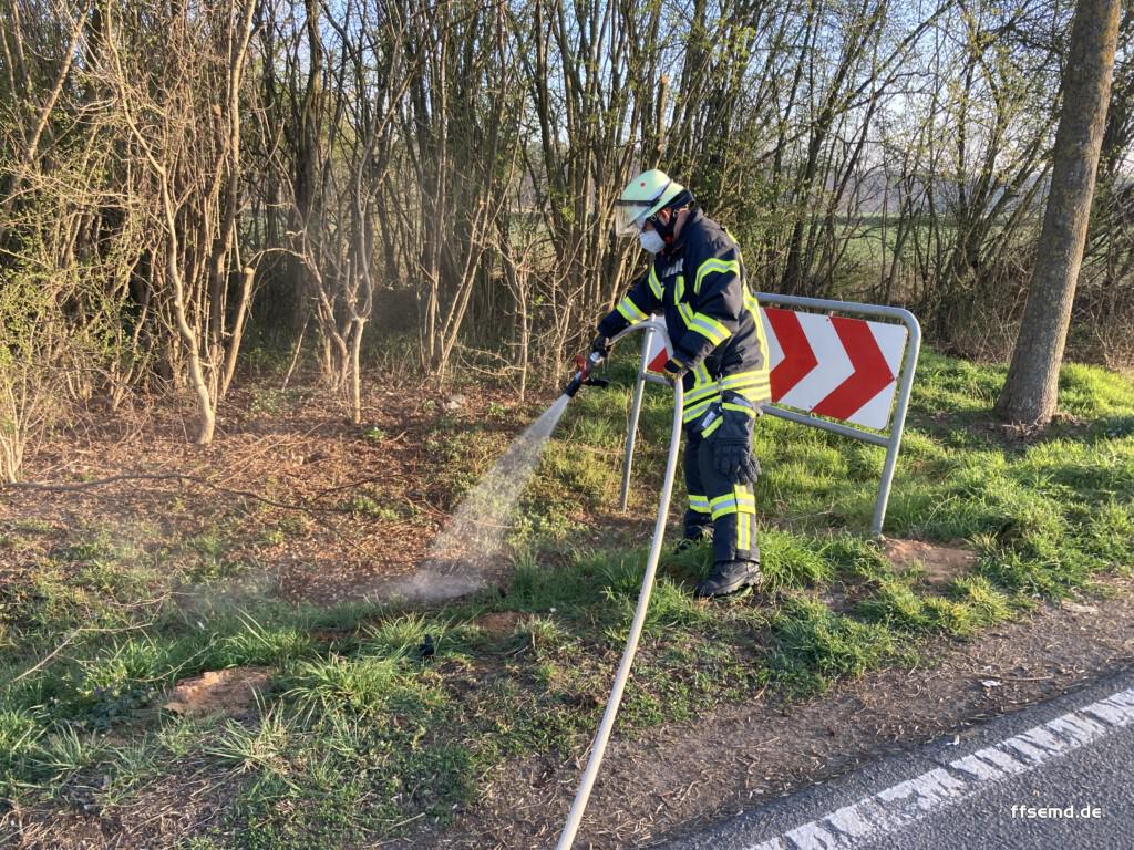 Ein kleiner Flächenbrand beschäftigte die Semder Feuerwehr am Sonntagmorgen. An der Landstraße 3115 in unmittelbarer Nähe zum Semder Kreuz (B45) entsorgt vermutlich jemand regelmäßig seine Asche von Pellets oder Briketts aus dem Ofen. Das kleine Feuer wurde mittels D-Schnellangriff und Wasser aus dem Fahrzeugtank abgelöscht.